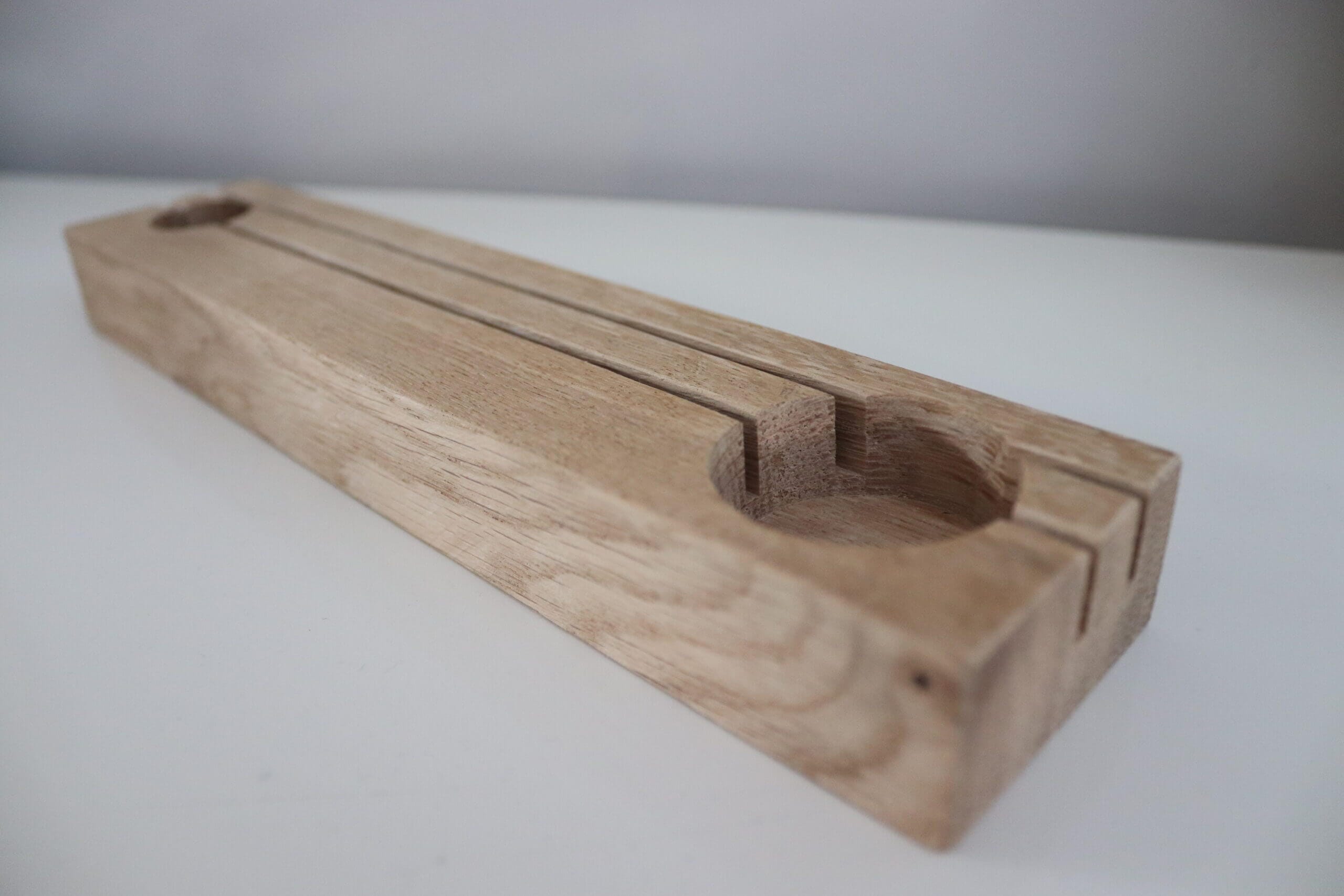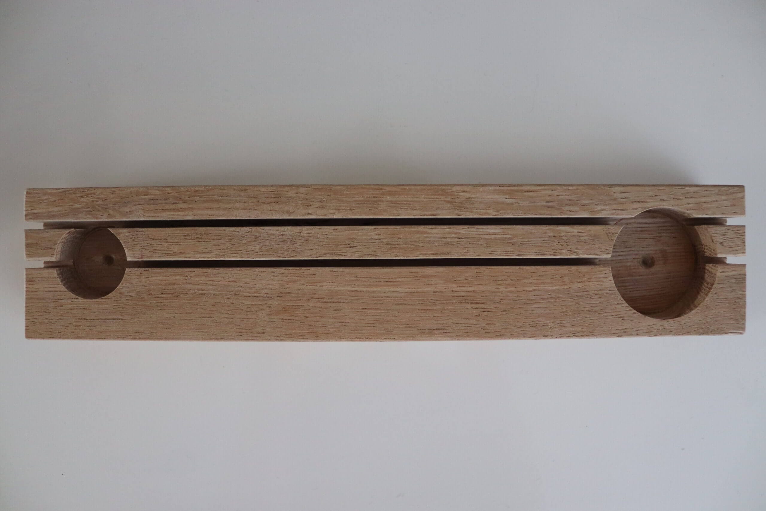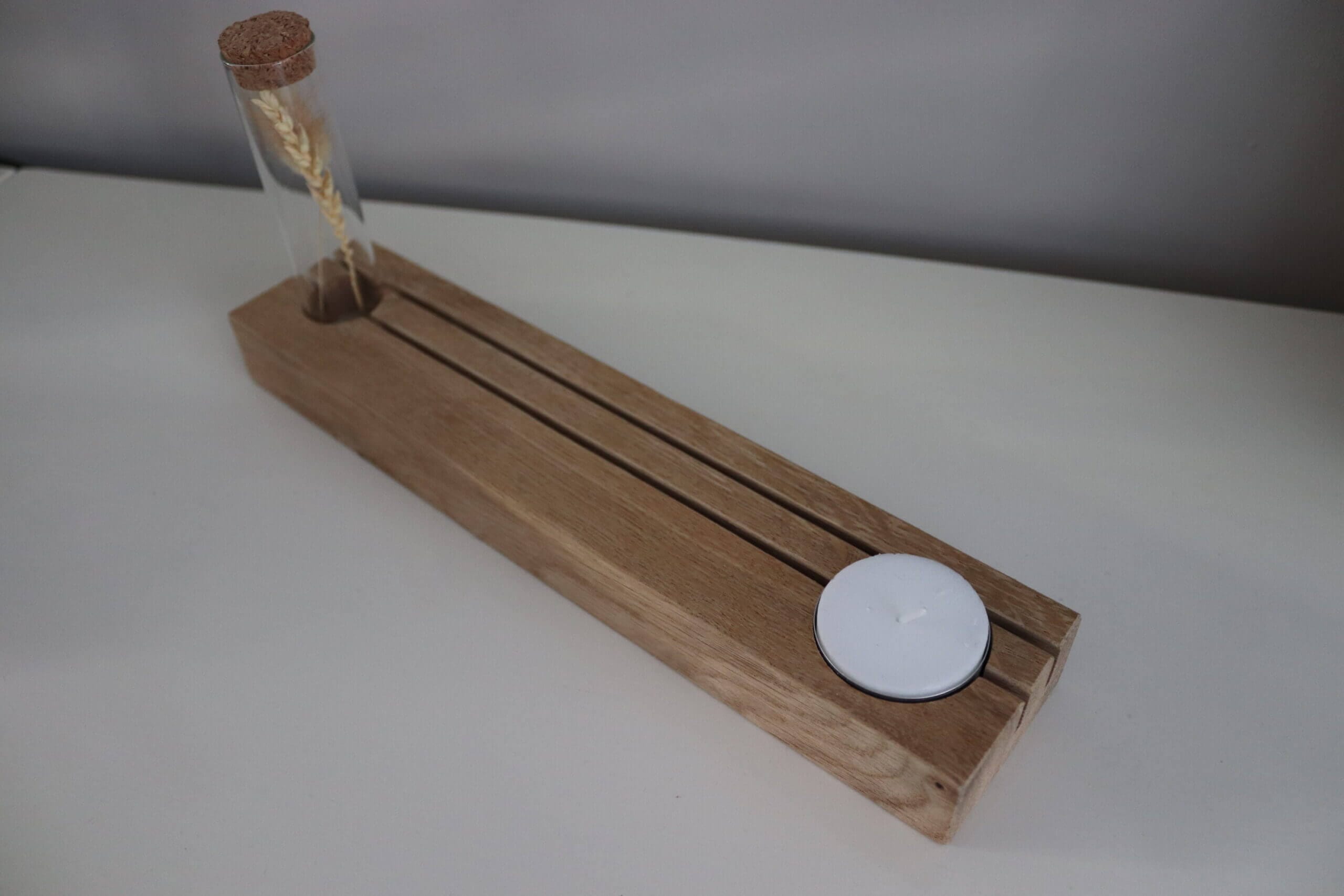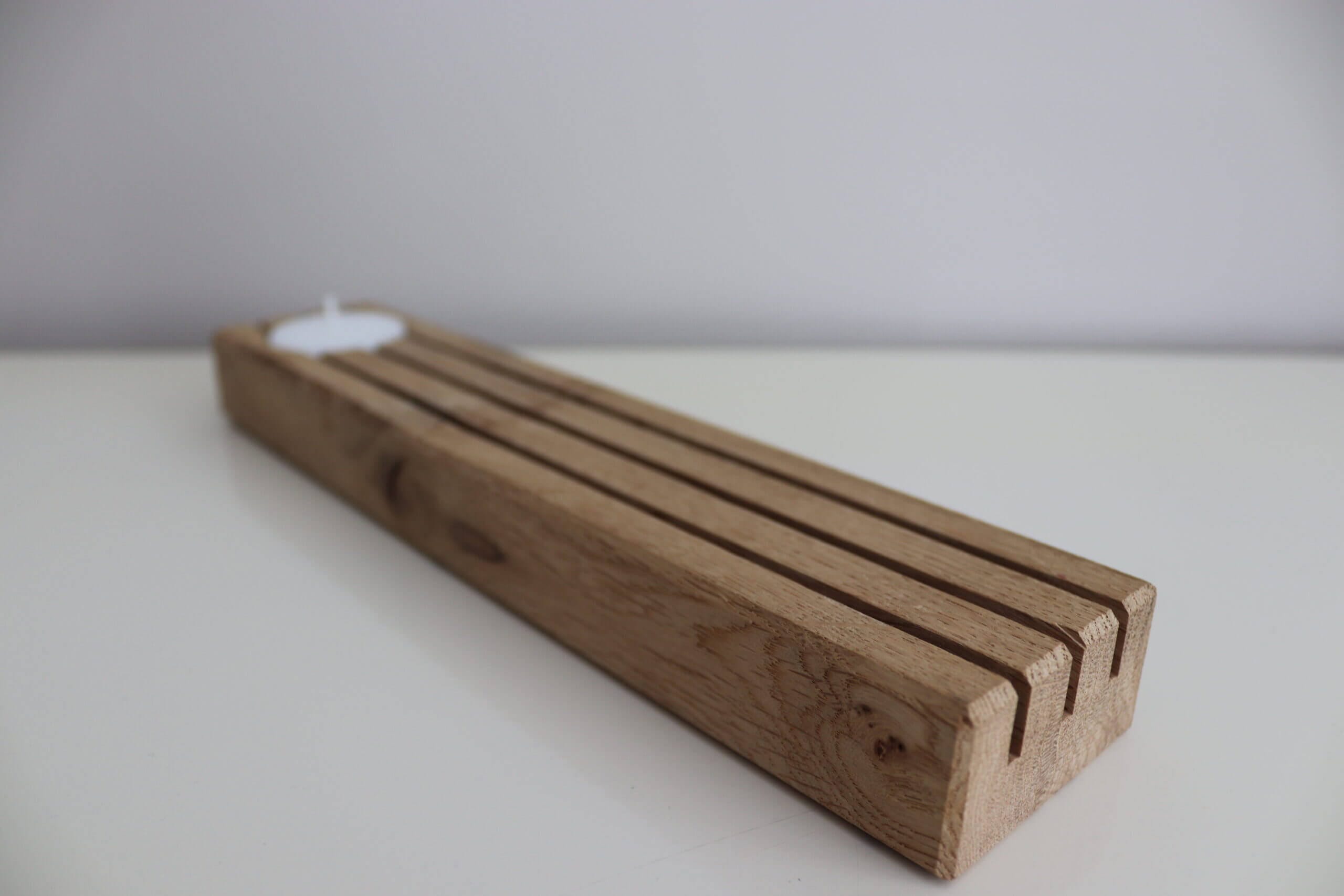 Eikenhouten kaarthouder 2: Een variant van kaarthouder 1, maar dan zonder glazen buisje. De kaarthouder wordt inclusief kaarsje geleverd.