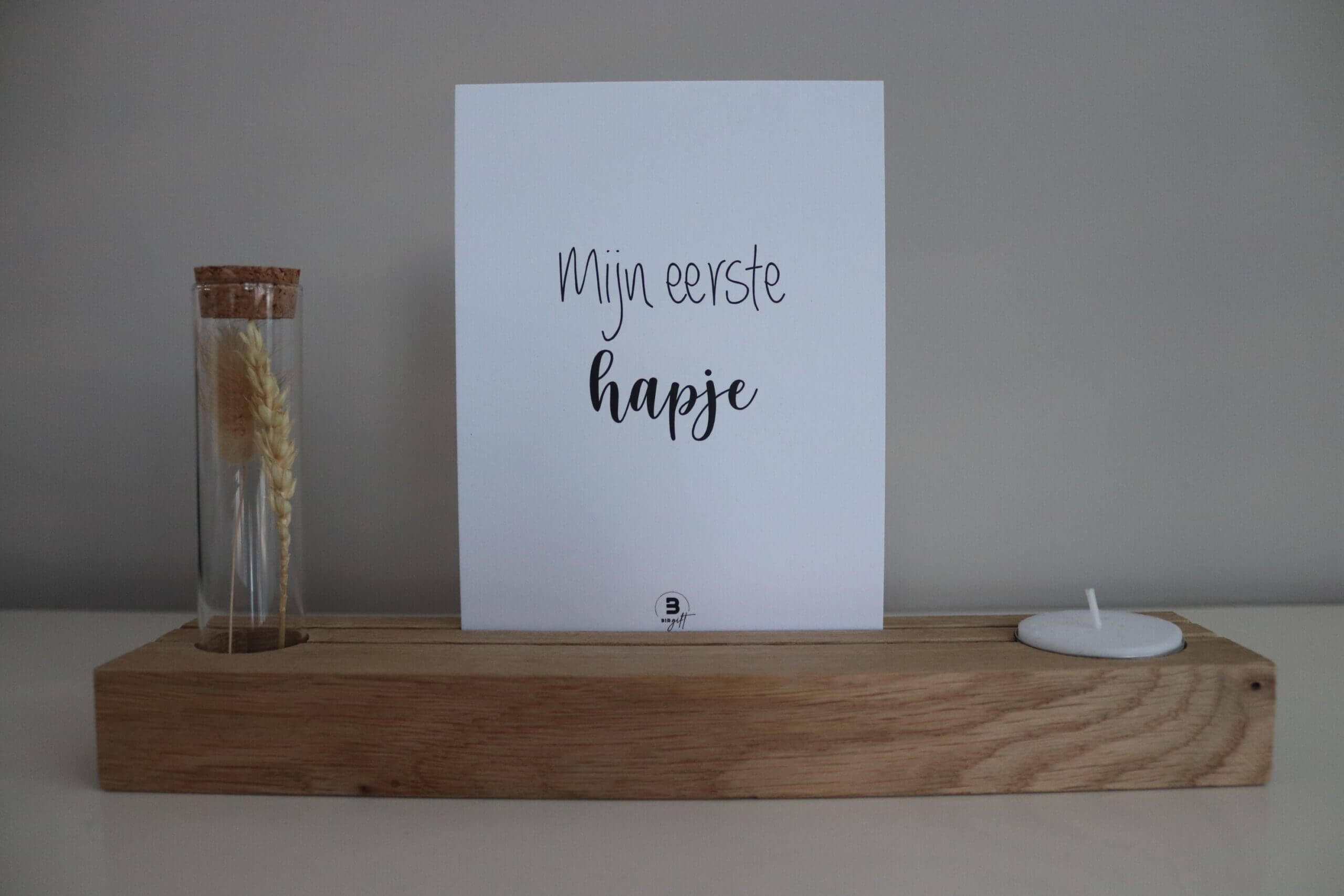 Eikenhouten kaarthouder 1: Deze eikenhouten kaarthouder is speciaal met de hand gemaakt voor het inzetten van bijvoorbeeld je mijlpaalkaarten. De kaarthouder wordt inclusief kaarsje en glazen buisje met kurk dop geleverd.