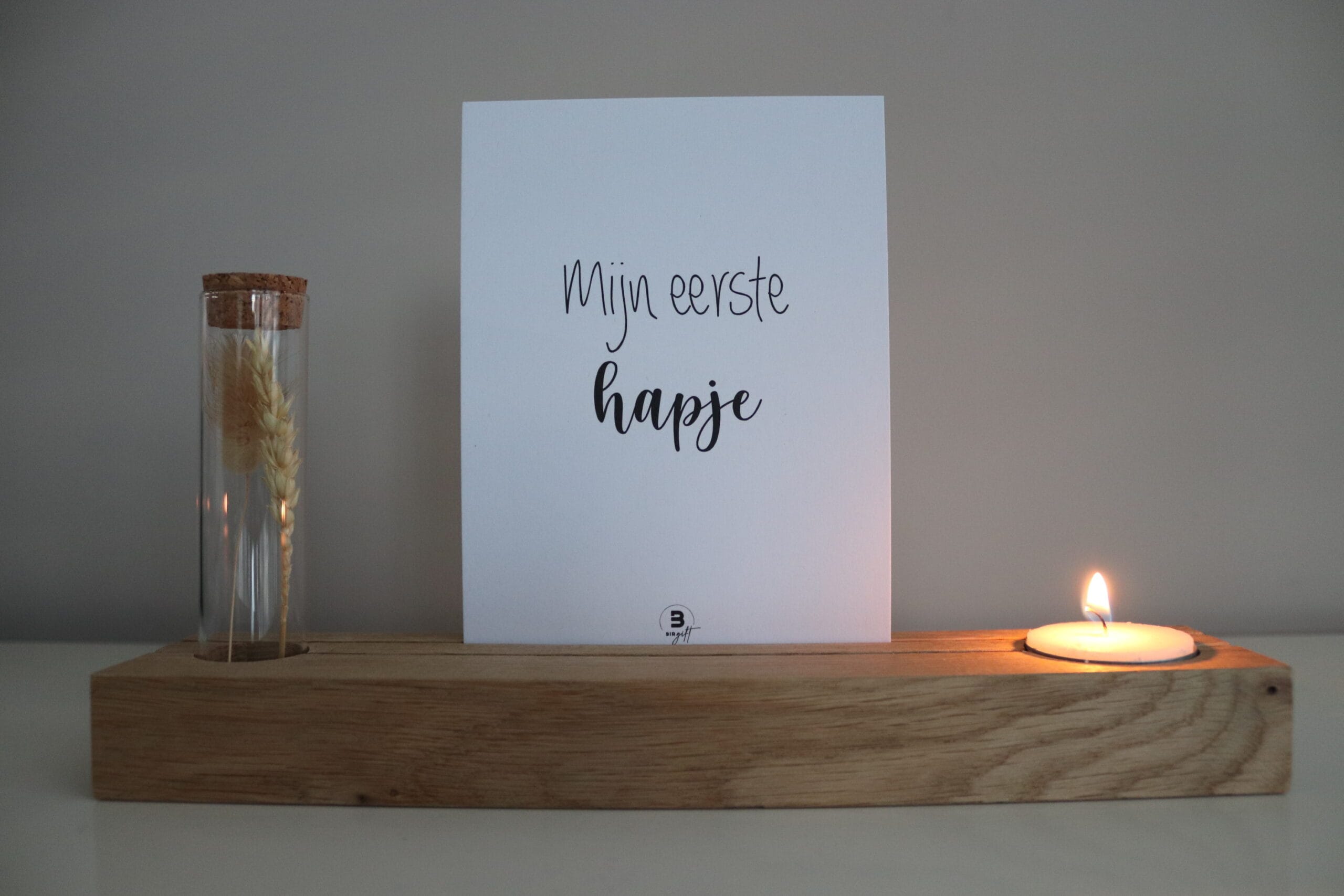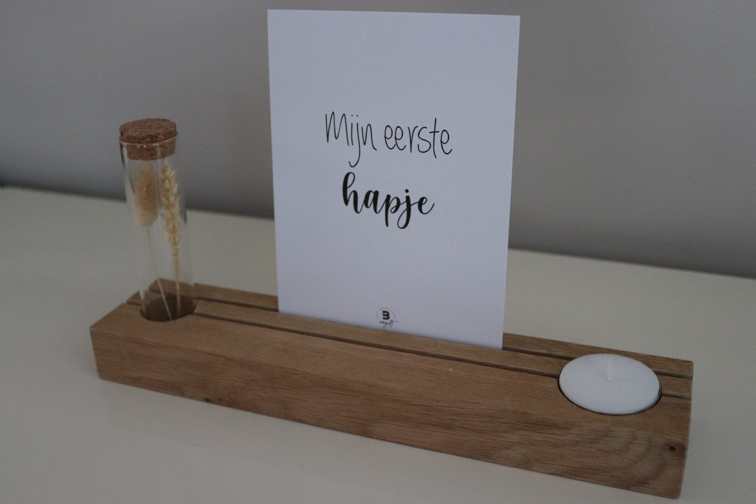Deze eikenhouten kaarthouders zijn speciaal met de hand gemaakt voor het inzetten van bijvoorbeeld je mijlpaalkaarten. De kaarthouders zijn inclusief kaarsje, ook het glazen buisje met kurk dop wordt erbij geleverd. Hier kan je bijvoorbeeld; droogbloemen, as van een dierbare, rijstkorrels wanneer geliefdes net getrouwd zijn of blauwe en roze muisjes wanneer er een kindje is geboren in doen. Je kan het helemaal naar eigen wens invullen.